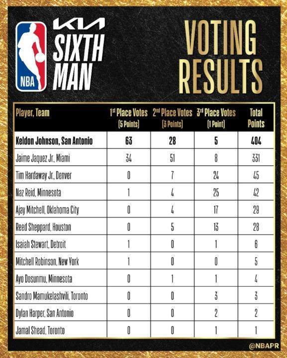 NBA官方宣布,马刺球员凯尔登·约翰逊当选年度最佳第六人。